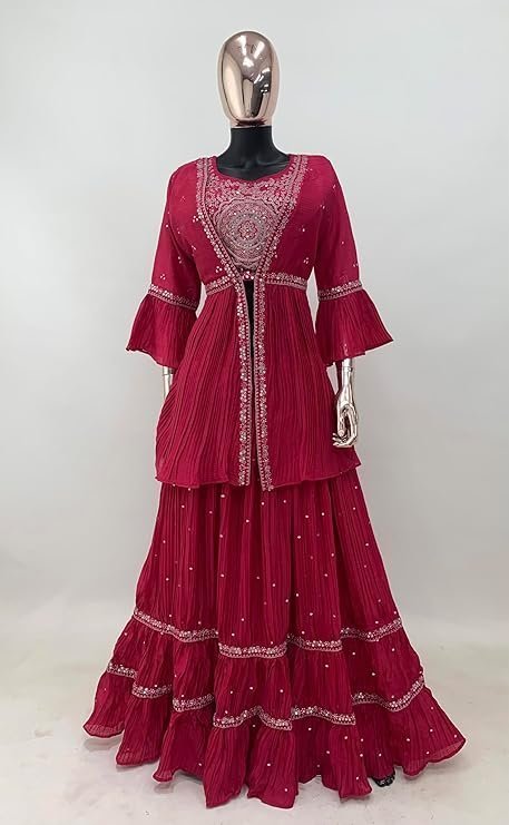 • Top Fabric : Chinon With Santoon Inner, Jacket Fabric : Chinon, Bottom Fabric : Chinon, Dupatta Fabric : Chinon